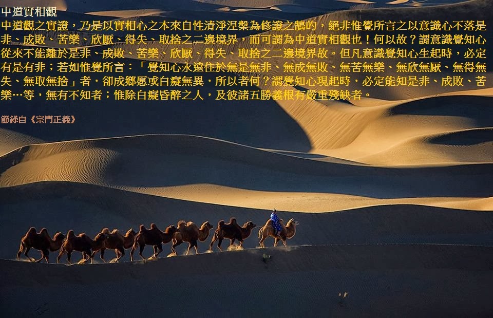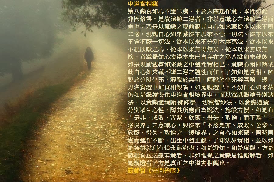 中道觀之實證,乃是以實相心之本來自性清淨涅槃為修證之鵠的,絕非惟覺所言之以意識心不落是非、成敗、苦樂、欣厭、得失、取捨之二邊境界,而可謂為中道實相觀也!何以故?謂意識覺知心從來不能離於是非、成敗、苦樂、欣厭、得失、取捨之二邊境界故。但凡意識覺知心生起時,必定有是有非;若如惟覺所言:「覺知心永遠住於無是無非、無成無敗、無苦無樂、無欣無厭、無得無失、無取無捨」者,卻成鄉愿或白癡無異,所以者何?謂覺知心現起時,必定能知是非、成敗、苦樂…等,無有不知者;惟除白癡昏醉之人,及彼諸五勝義根有嚴重殘缺者。